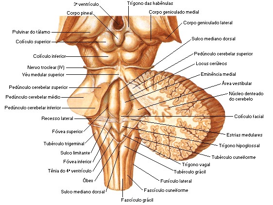 No Mesencéfalo – o sulco troclear, os quatro Colículos (que formam o teto do IV ventrículo).