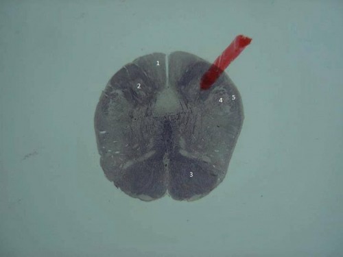 1. Núcleo Grácil; 2. Núcleo Cuneiforme; 3. Pirâmide; 4. Núcleo Espinhal do Nervo Trigêmeo; 5. Trato Espinhal do Nervo Trigêmeo